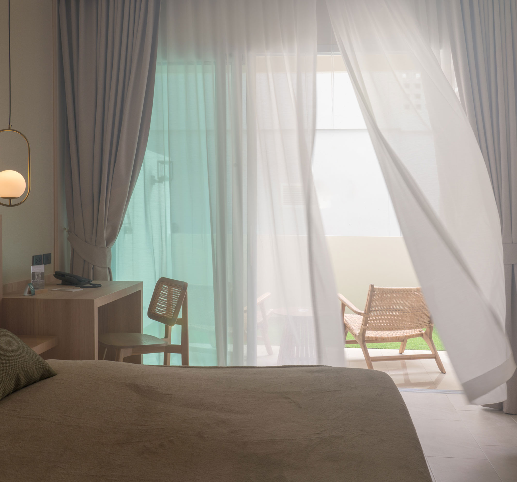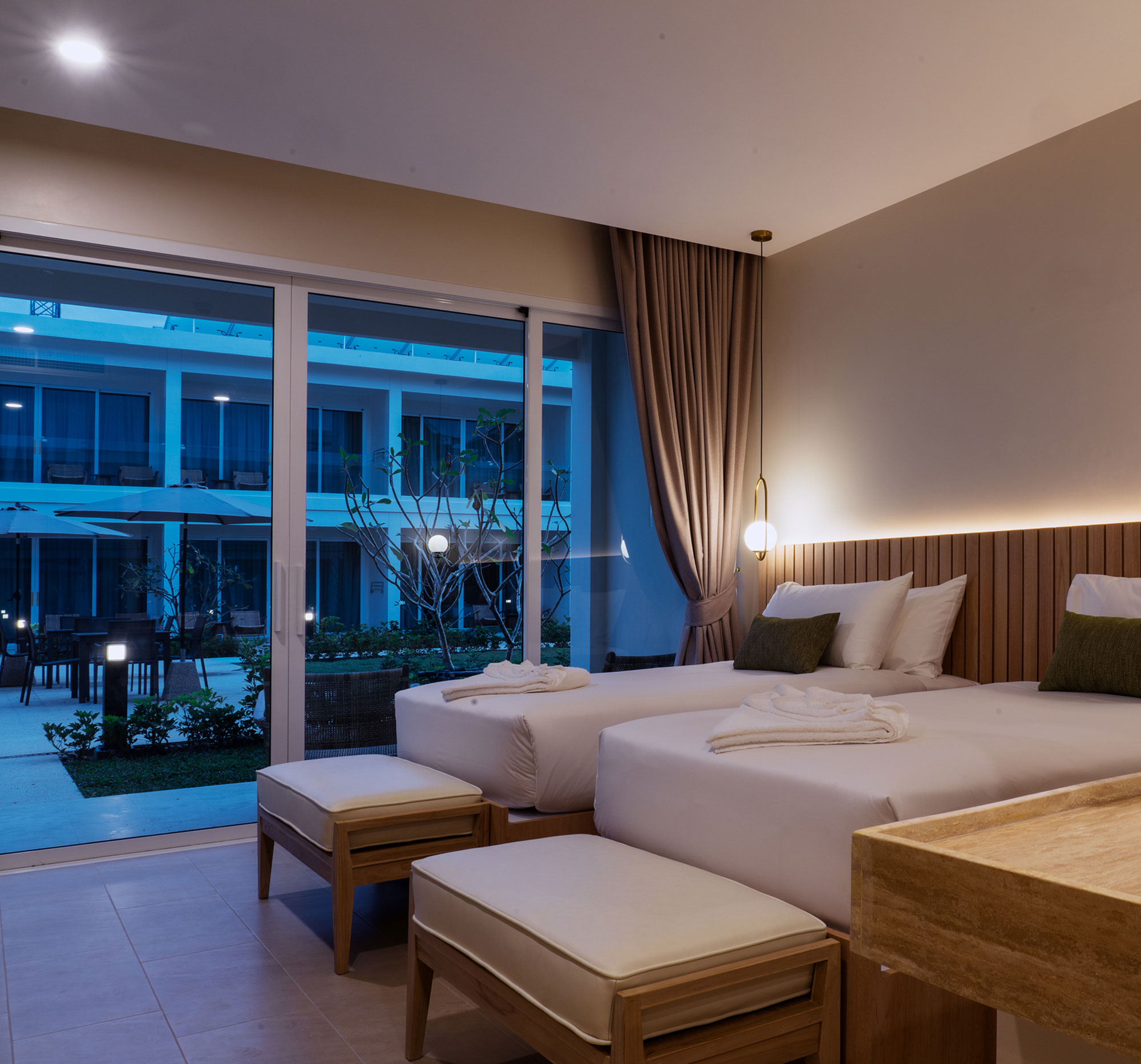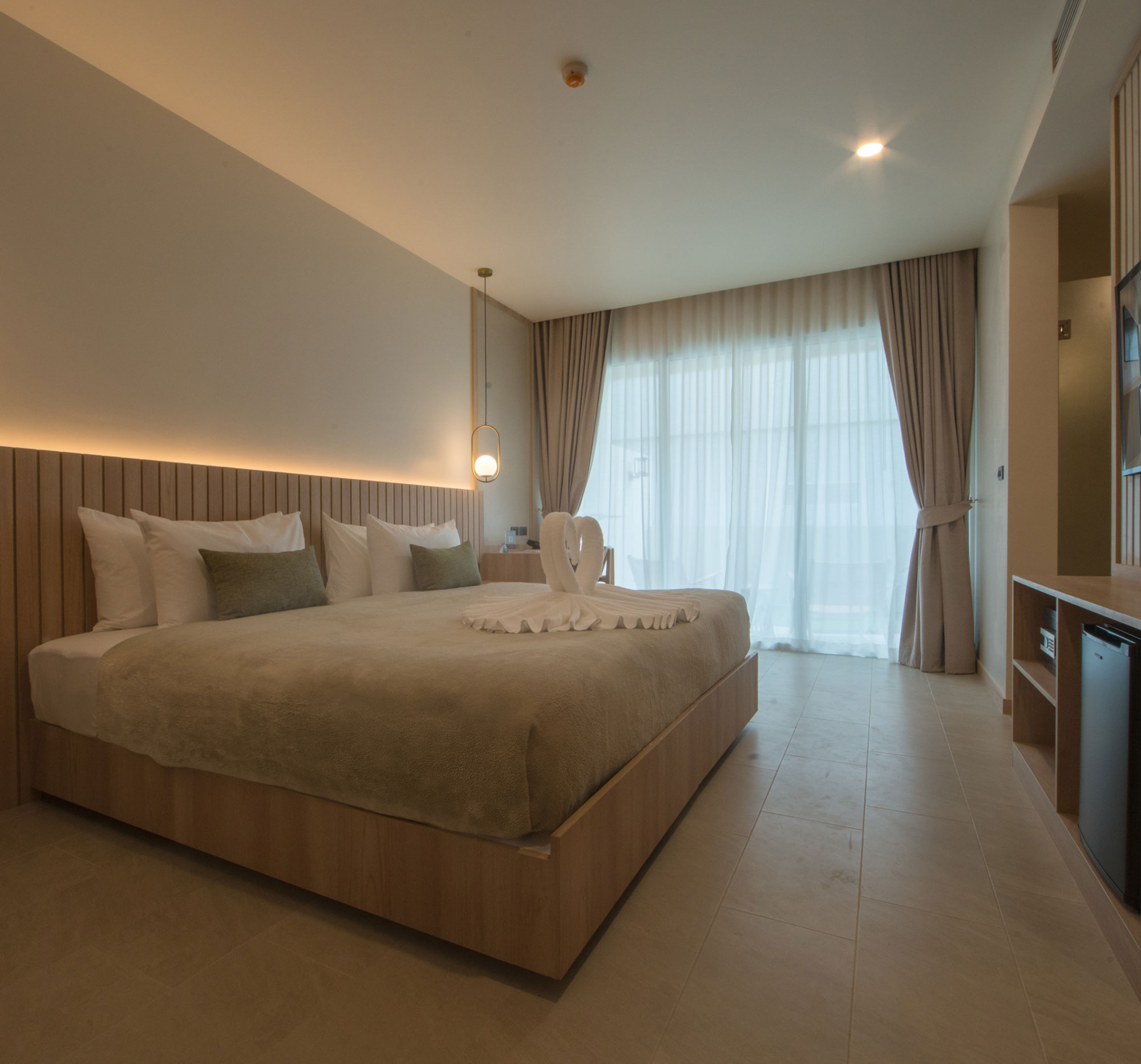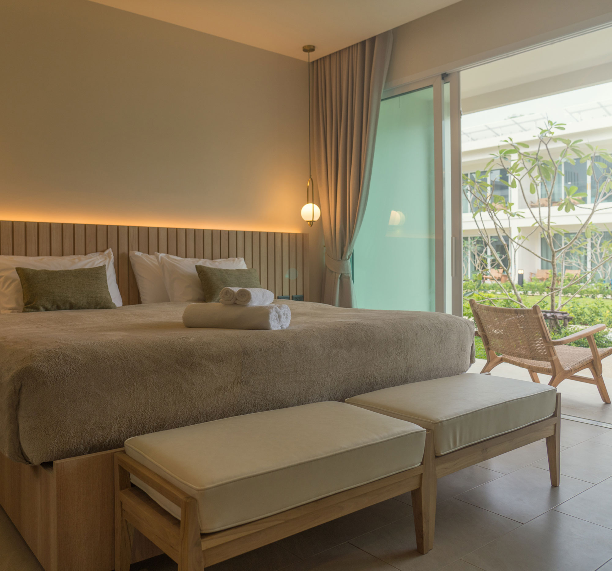Однокомнатный номер с балконом с видом на сад, панорамными окнами и собственной ванной комнатой с душем, феном и фирменной косметикой. Для размещения служат одна двуспальная или две односпальные кровати. Из прочих удобств - Wi-Fi, кондиционер, сейф, телевизор, телефон, набор для приготовления чая и кофе, халаты и тапочки.
