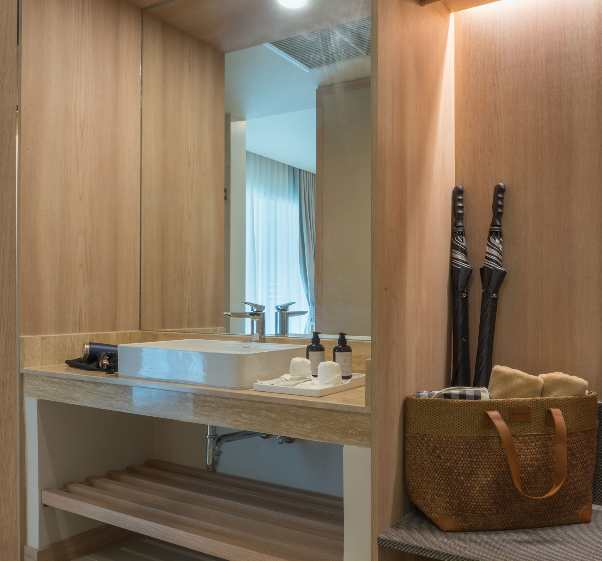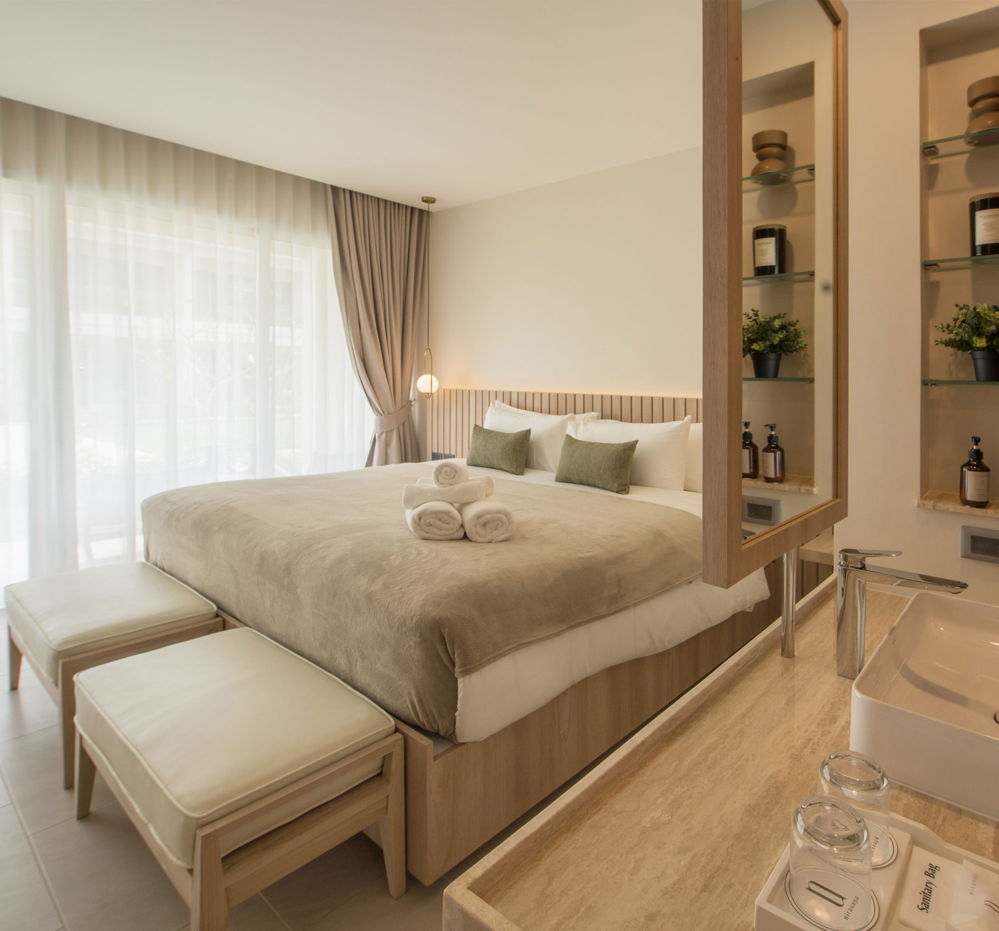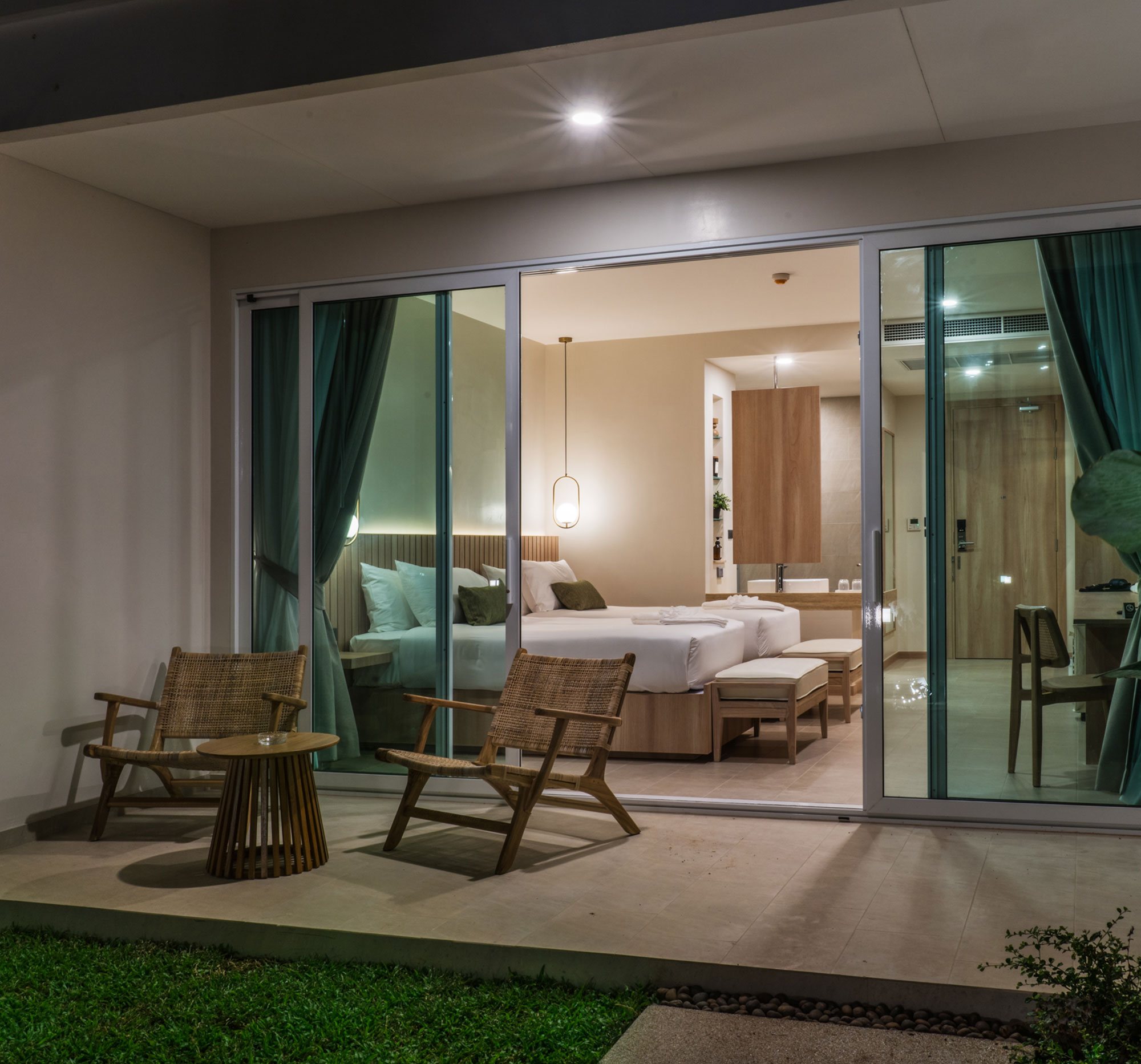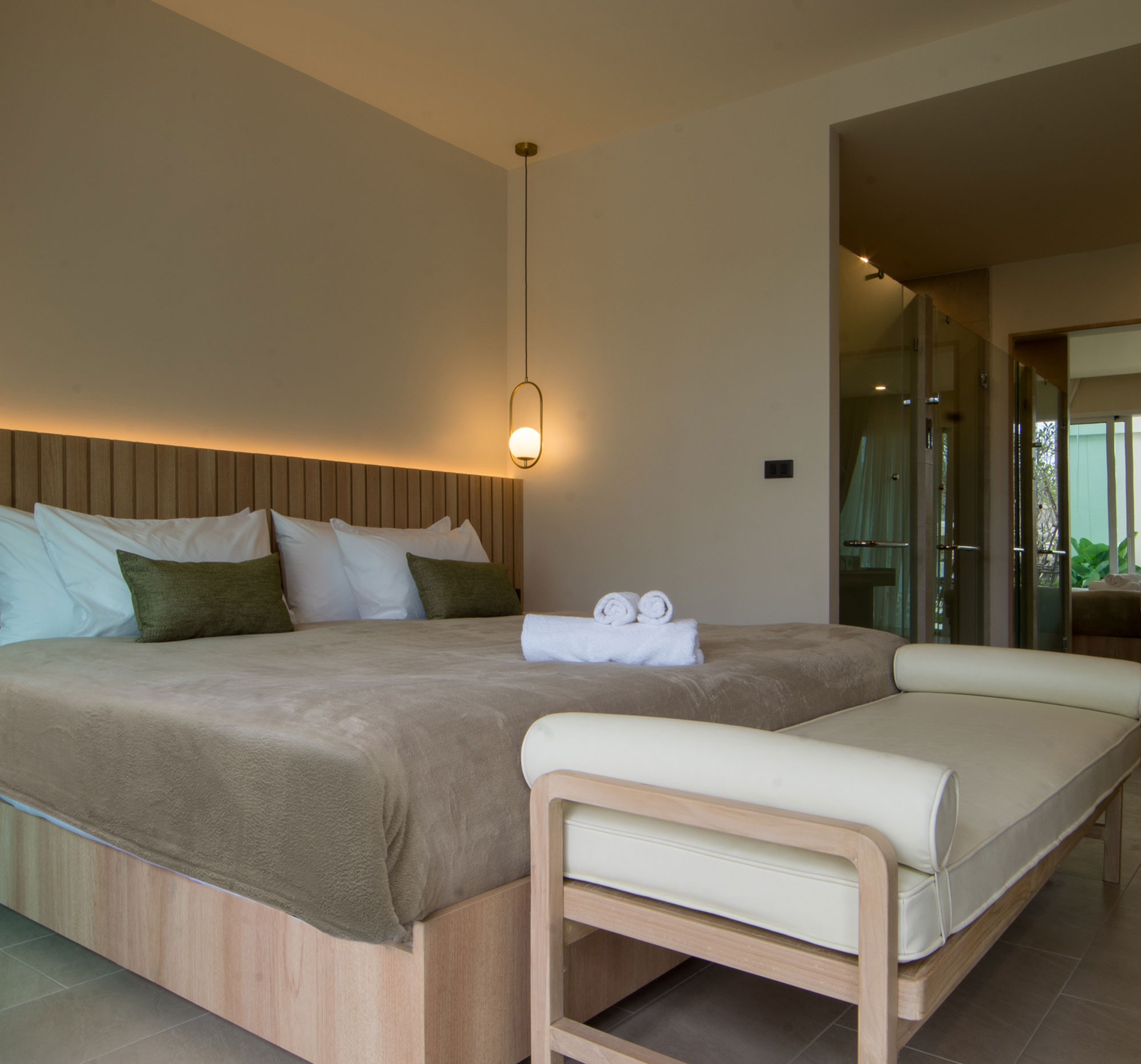 Однокомнатный номер с балконом с видом на сад, панорамными окнами и собственной ванной комнатой с душем, феном и фирменной косметикой. Для размещения служат одна двуспальная или две односпальные кровати. Из прочих удобств - Wi-Fi, кондиционер, сейф, телевизор, телефон, набор для приготовления чая и кофе, халаты и тапочки.