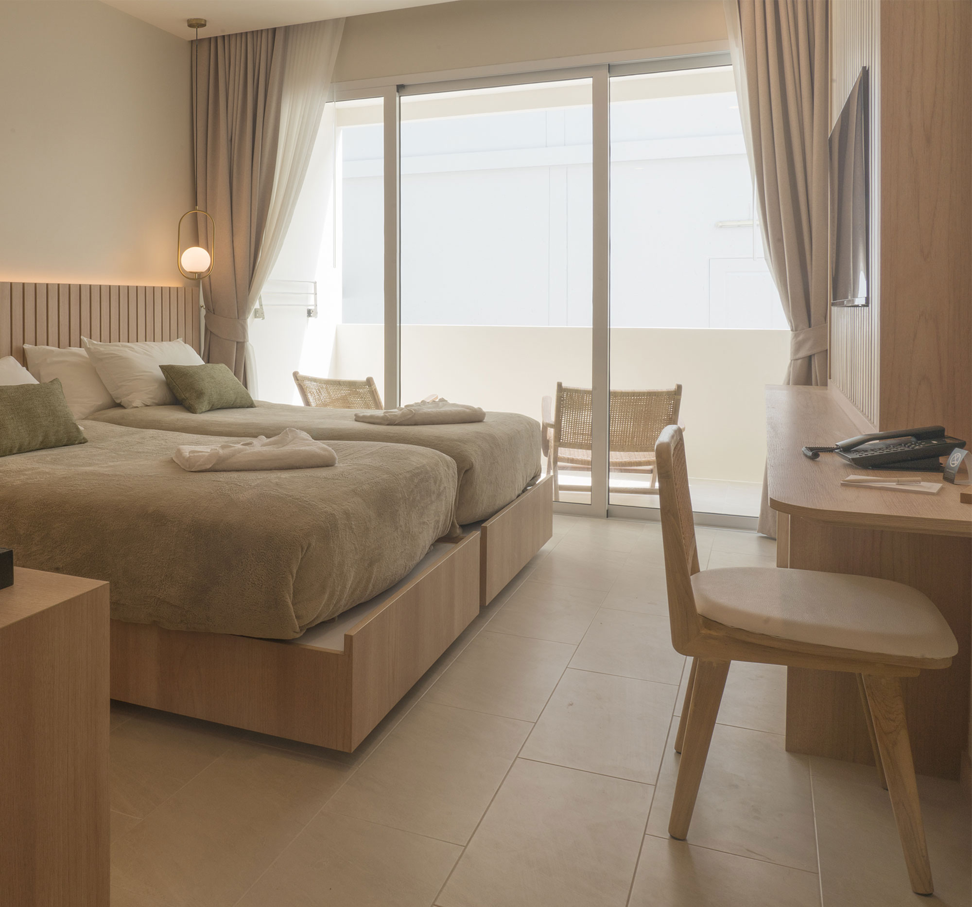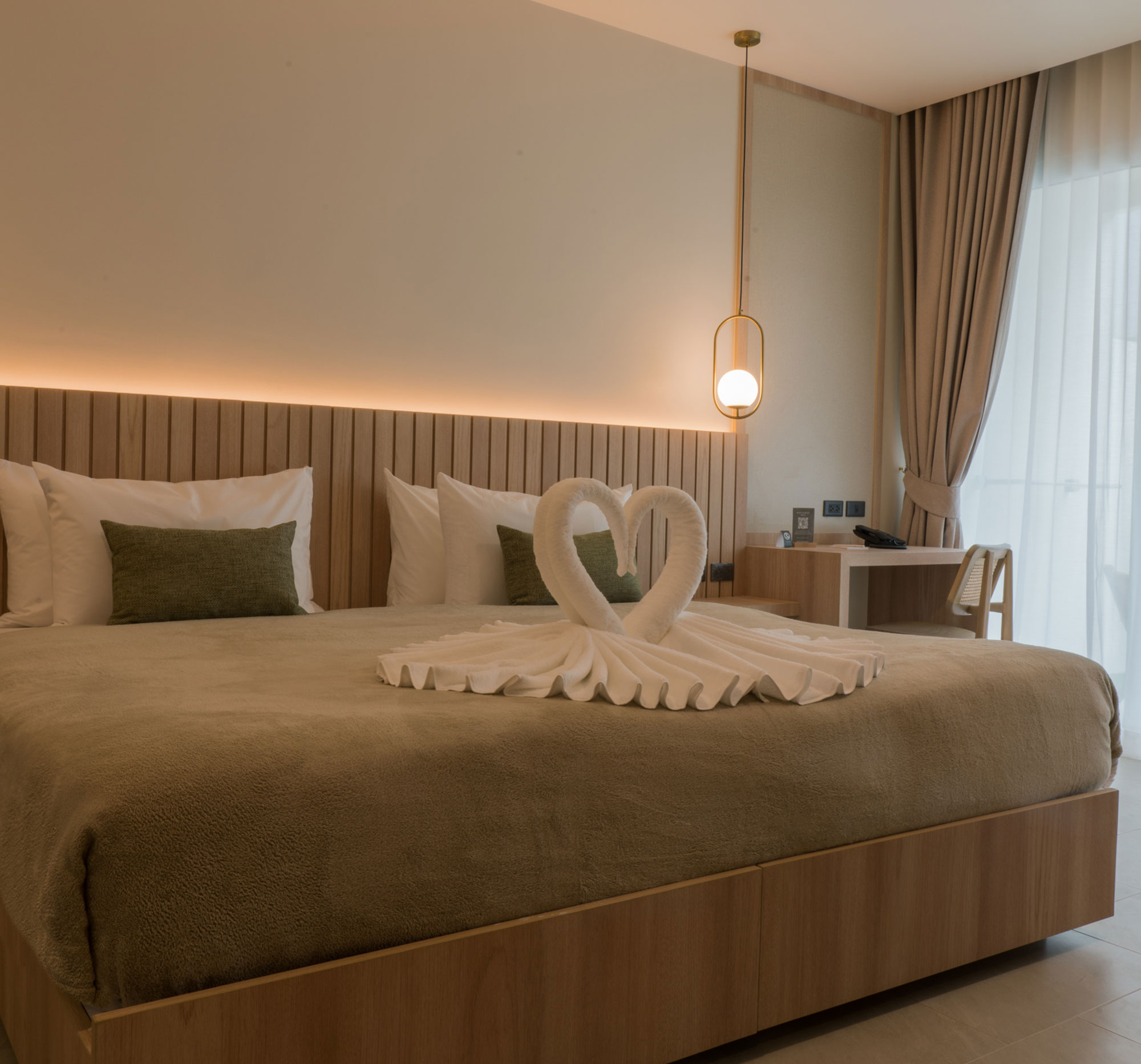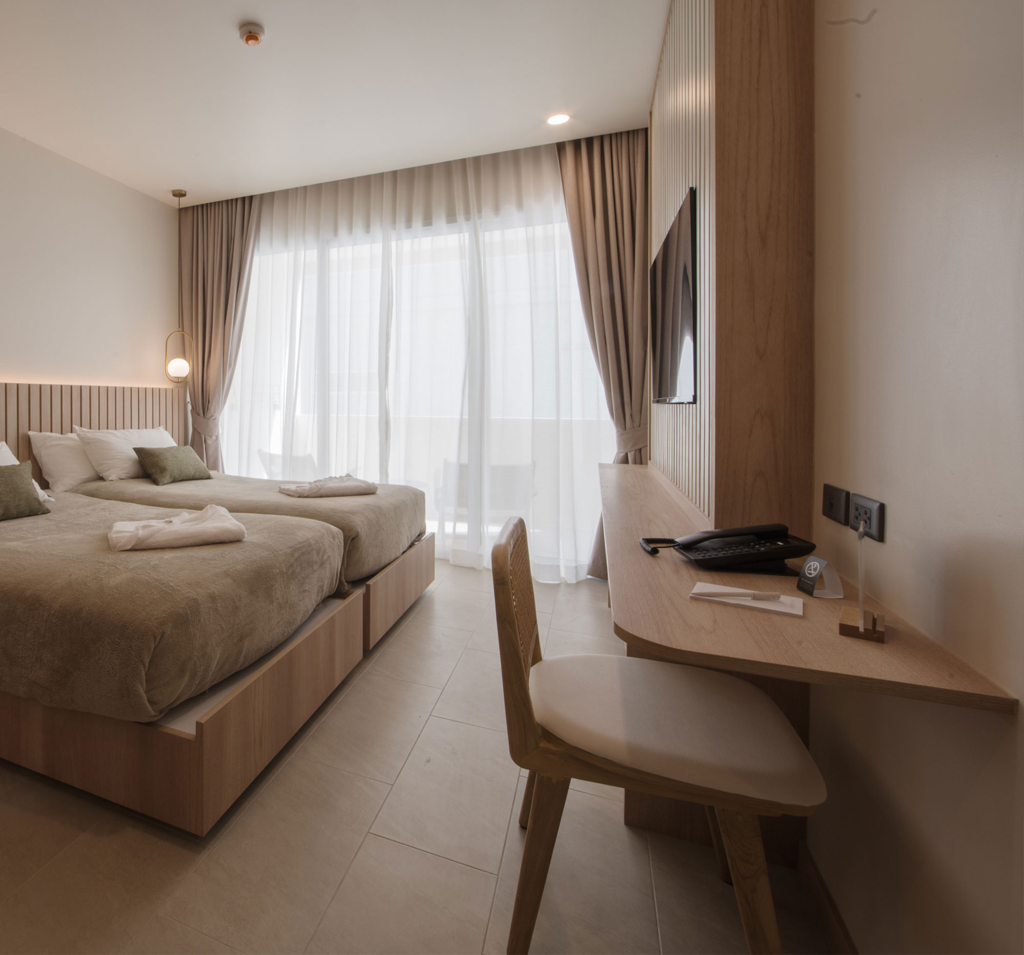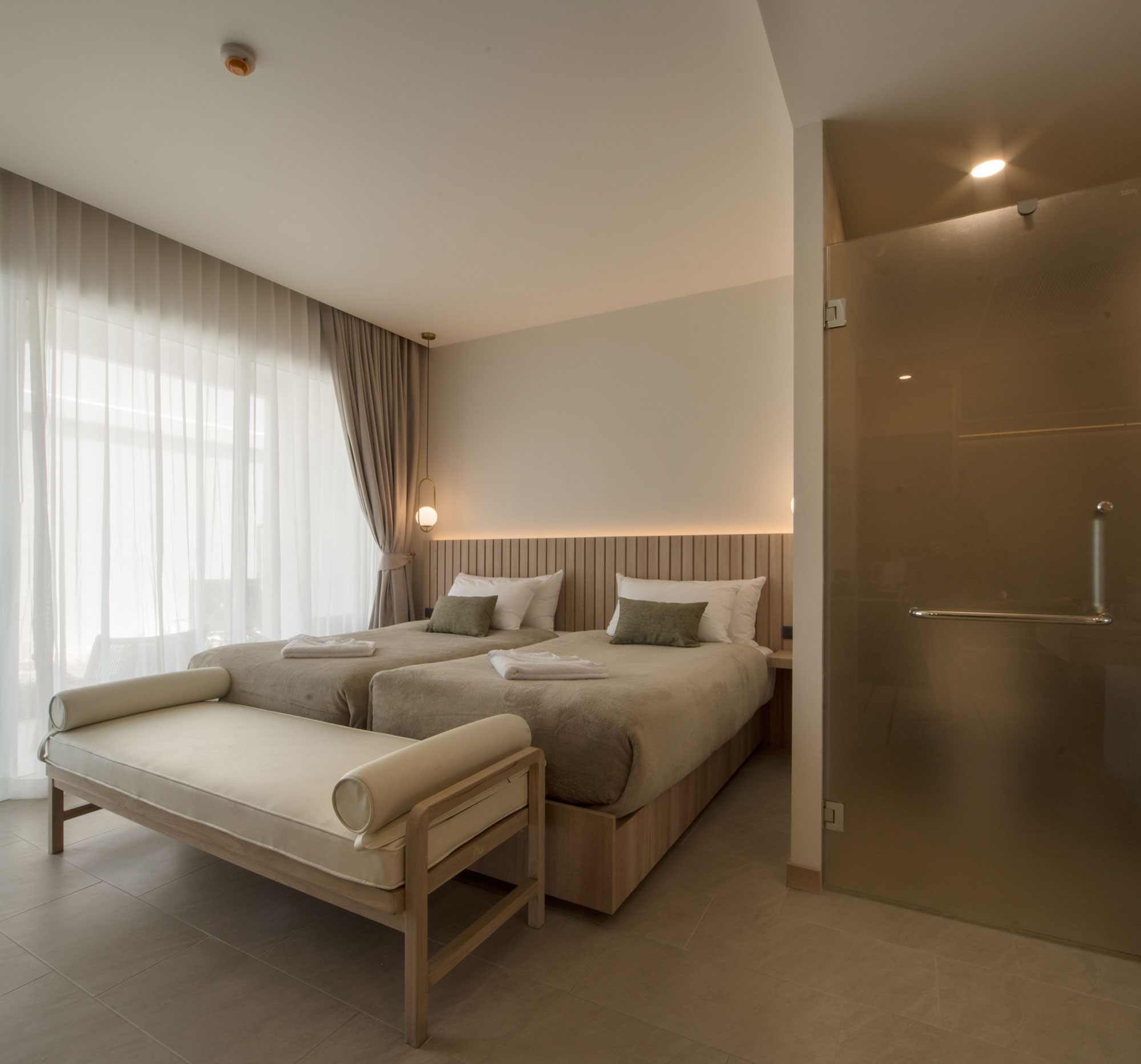 Улучшенный номер с панорамными окнами, балконом и собственной ванной комнатой с душем, феном и туалетно-косметическими средствами. Для размещения гостей служат две односпальные кровати или одна двуспальная. В числе прочих удобств Интернет, кондиционер, сейф, телефон, телевизор, халаты, тапочки и набор для приготовления чая и кофе.