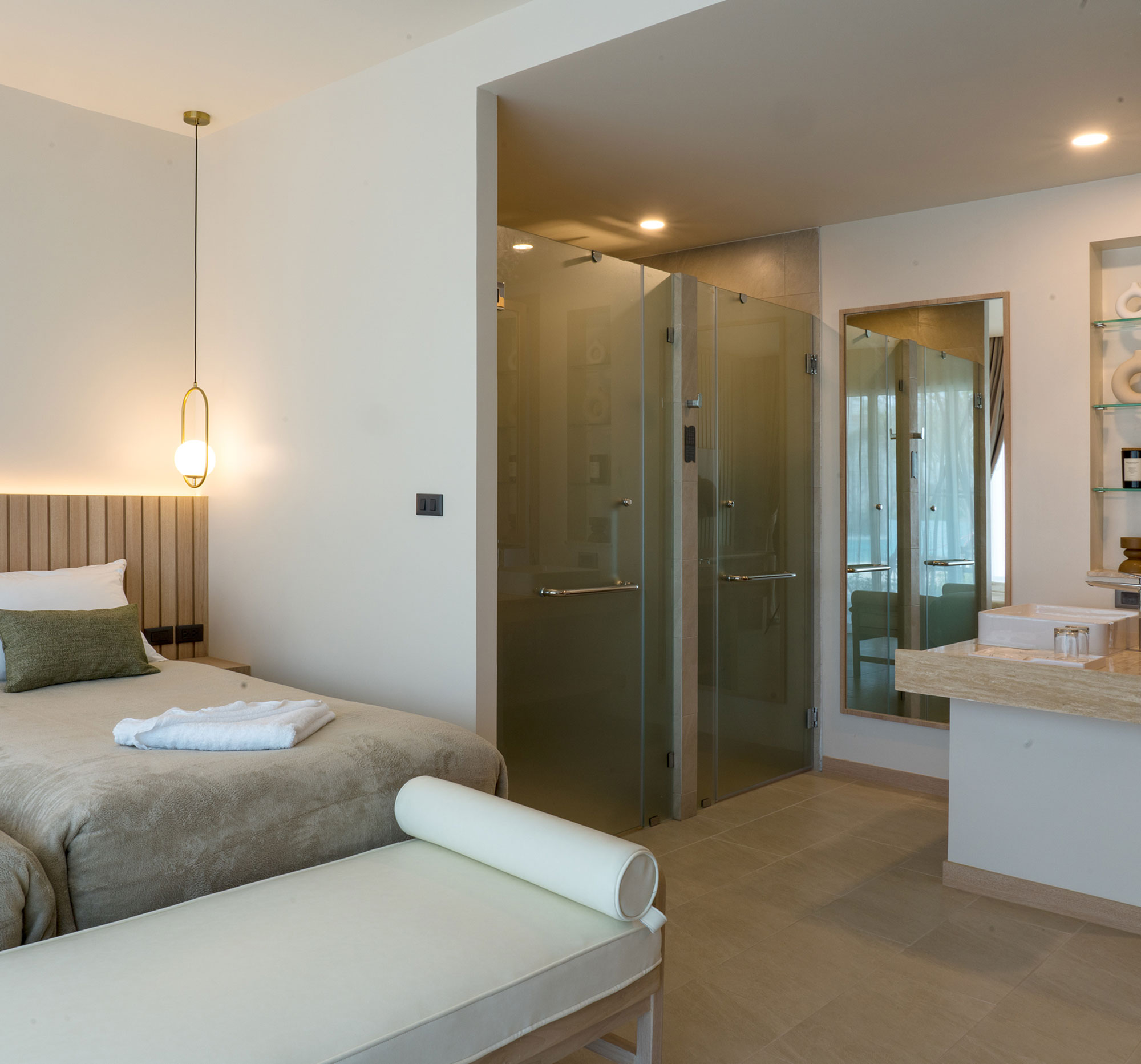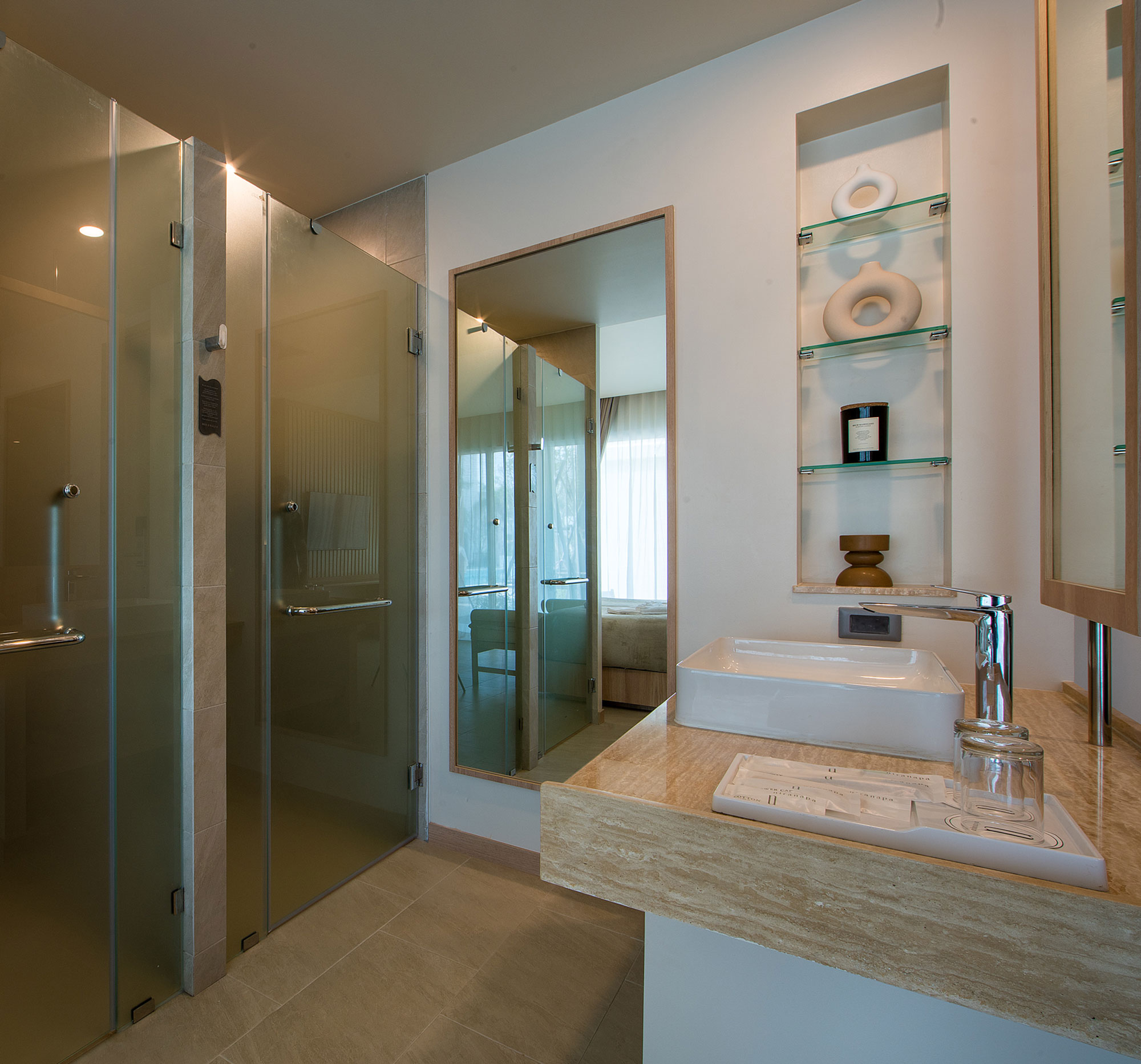 Однокомнатный номер с собственной ванной комнатой с душем, феном и туалетно-косметическими средствами, балконом с шезлонгами, панорамными окнами. Для гостей предлагается одна двуспальная или две односпальные кровати, Интернет, кондиционер, телевизор, сейф, телефон, халаты и тапочки, набор для приготовления чая и кофе.